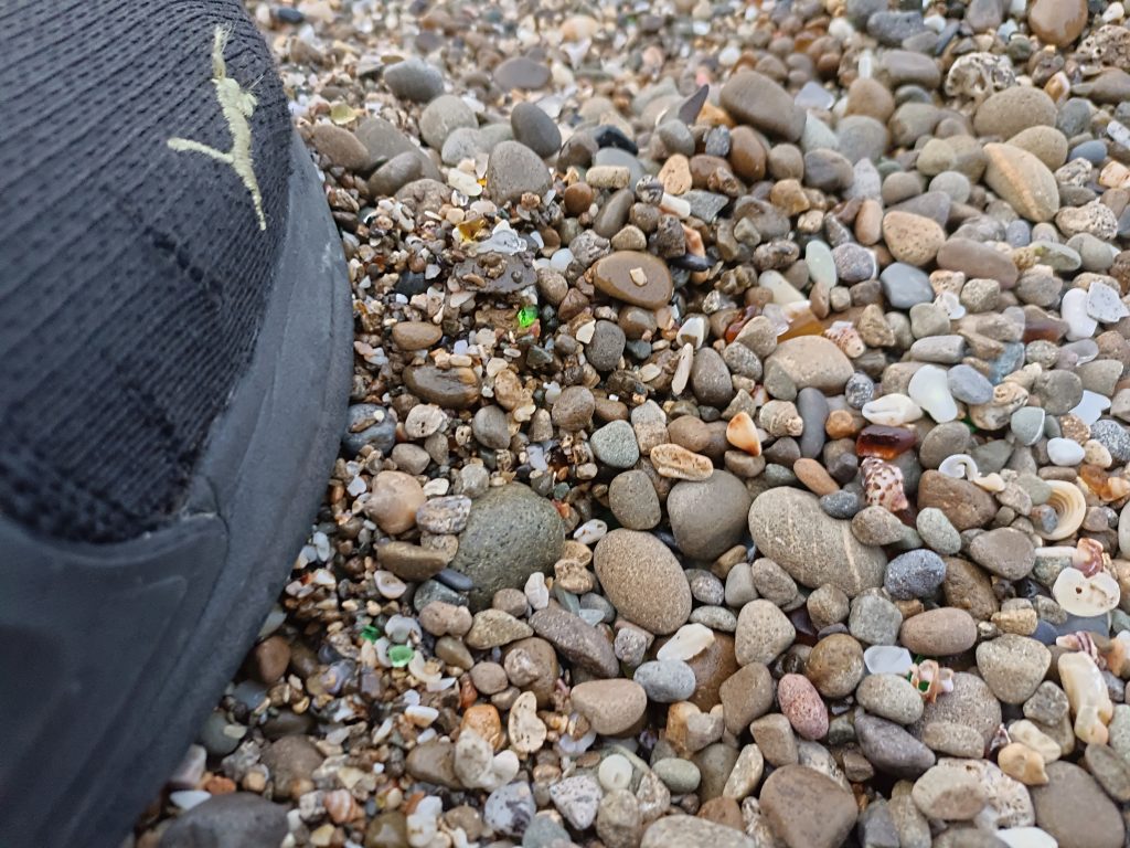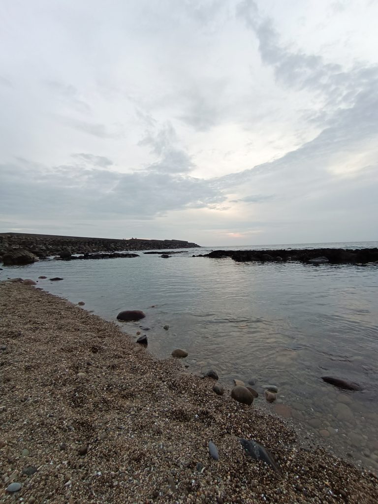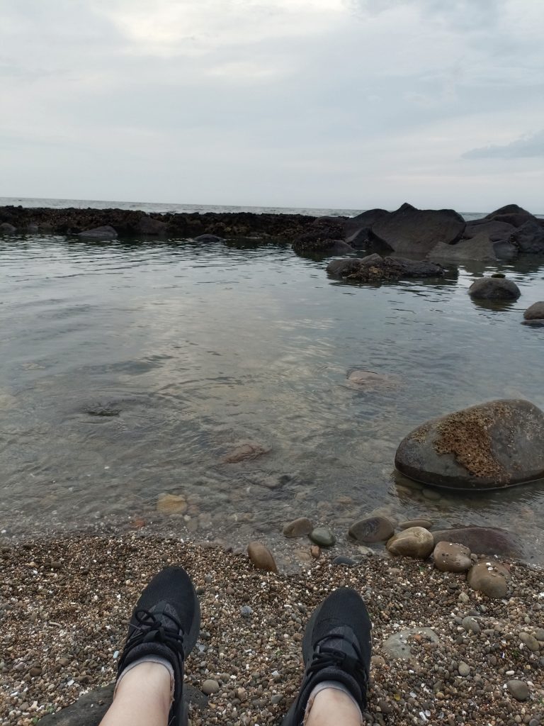 這邊應該是屬於岩石海岸,非沙灘,踏入鞋子也不會被細沙入侵。海水的味道偏重,有點腥!?以及微溫的海水。