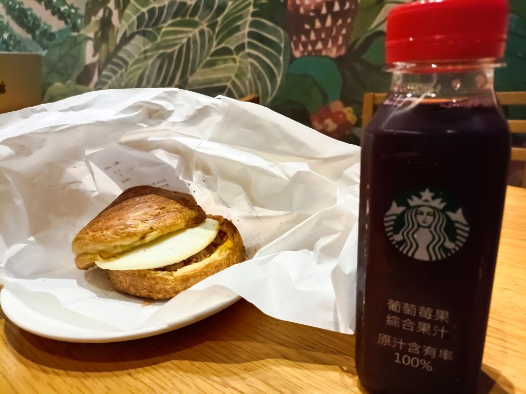 看海看到太陽下山,往回走,但天色漸黑,沒有特別注意到來的路上的街道指標等,後來搭上公車,才安心回到輕軌紅樹林站。仍然沿途沒有許多店家,就選擇最近的星巴克了,運動過後食物特別美味。┏(^0^)┛