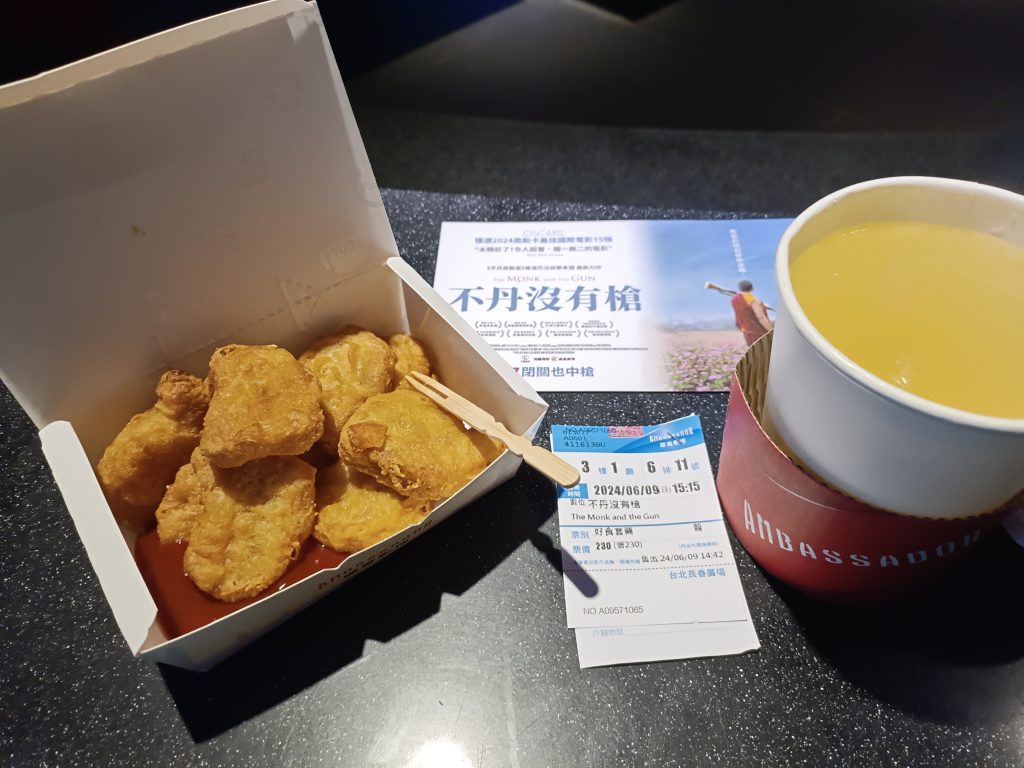 這次因為是臨時起意在台北看電影,憶起大約10年前吧,在秀泰看看過電影,對舒適的沙發座椅印象深刻,但可惜這部目前秀泰電影院沒有放映,改選長春國賓影城,票價230元相當超值,搭食物雞塊9塊合計340,飲料另外算,柚子熱茶90。